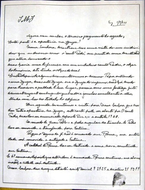 En 1998, el fallecido P. Malachi Martin afirmó en el programa “The Art Bell Show” que, a principios de febrero de 1960, cuando era Secretario del Cardenal Bea, tuvo la oportunidad de leer el Tercer Secreto de Fátima, que, según él, estaba escrito en una sola hoja de papel. Dijo que las palabras de Nuestra Señora eran muy escuetas y específicas, y hablaban de un futuro “papa” — un impostor- que usurparía la Sede Romana, estando totalmente dominado por el Demonio. Así, pues, el Tercer Secreto de Fátima revela el “misterio de iniquidad” (2 Tes 2:7): La falsa Iglesia “Católica” — la contra Iglesia, la anti Iglesia — el misterio del dragón, cuya cola derribó la tercera parte de las “estrellas del Cielo”, esto es, la tercera parte de la Jerarquía católica, bajo el liderato del antipapa herético.
