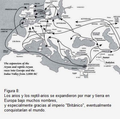 Así que estos pueblos arios blancos bajo nombres diferentes con su misma religión y héroes religiosos bajo nombres diferentes, se expandieron desde sus orígenes en el Cáucaso y Medio y Cercano Oriente y fueron por tierra hacia Europa, India y tan lejos como China. Y dentro de ellos estaban los linajes reptil-humanos que lucharon por, y al final ganaron, la supremacía para controlar el curso de los eventos como los reyes, reinas, sacerdotes y jefes militares bajo el título colectivo que llamo la Hermandad Babilónica.