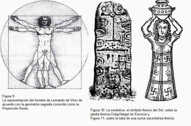 La cruz roja era la cruz de fuego, un símbolo fenicio-ario para el Sol, como era la esvástica, después utilizada por los Nazis. Una esvástica puede ser vista sobre una piedra dedicada al dios Sol fenicio Bel, que fue encontrada en Craig-Narget en Escocia y fue usada para decorar las batas de sus sumas sacerdotisas (Figuras 10 y 11).