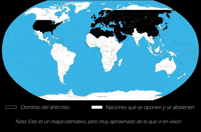 Mientras él me decía todas estas cosas, el Señor me muestra un mapa del mundo, al principio los países aparecían todos de color blanco y poco a poco algunos de ellos cambiaron a color negro. Estos países eran los que estaban bajo el control del anticristo y los que quedaban en color blanco los que se opusieron a su control.